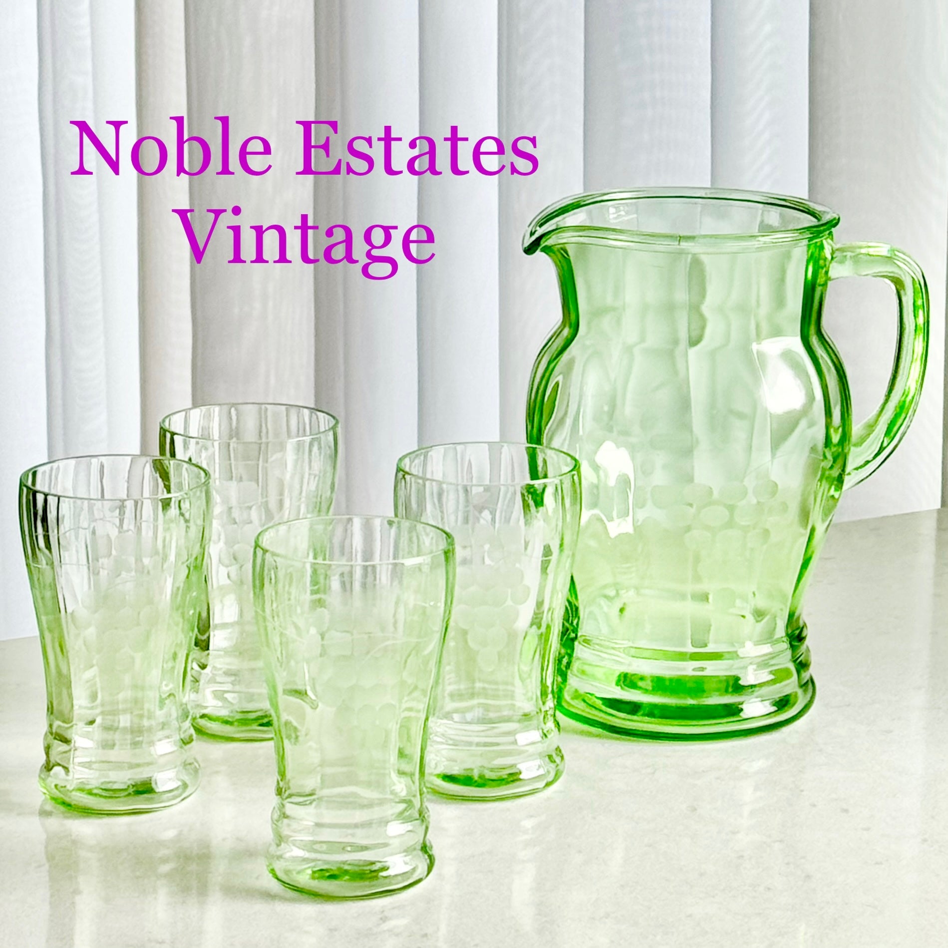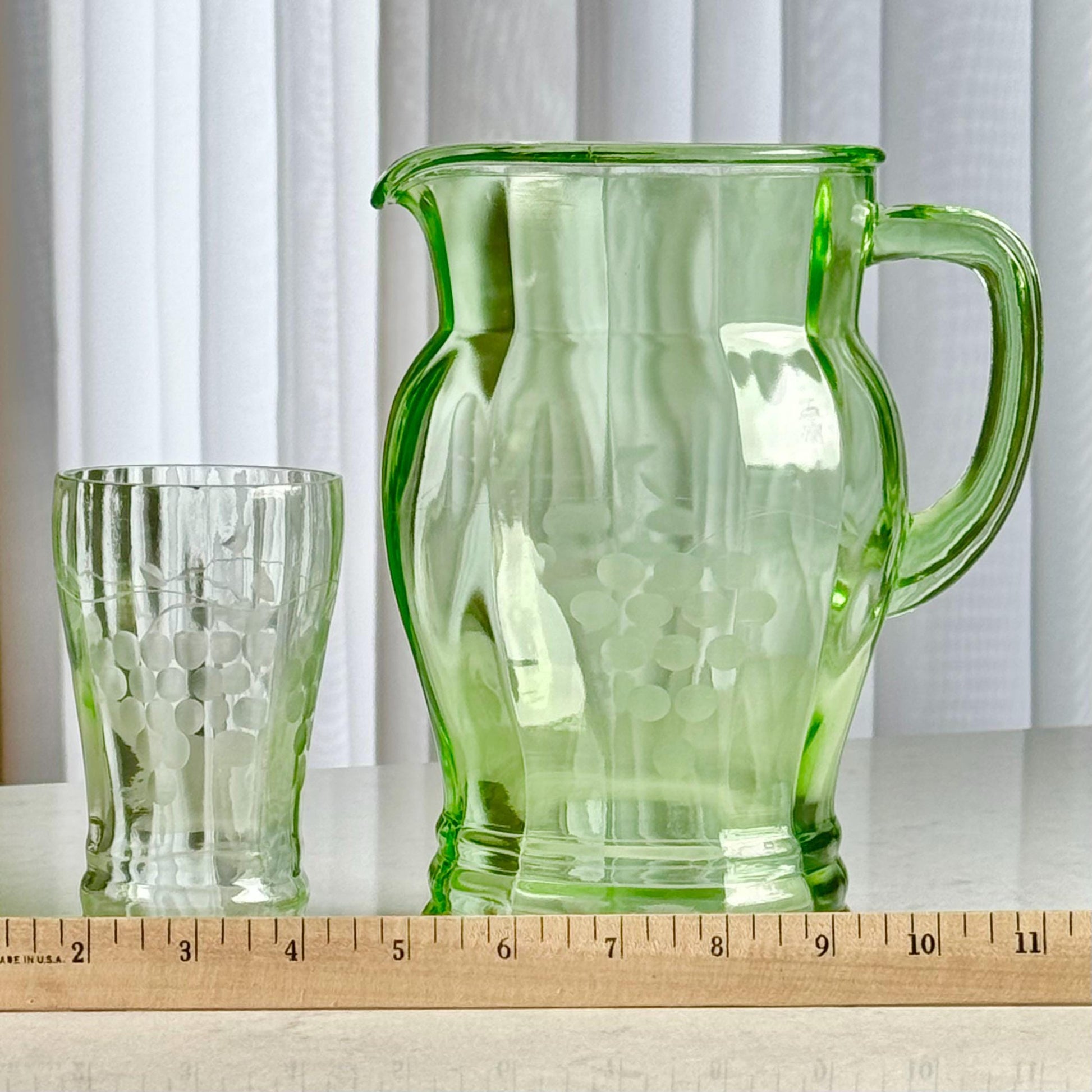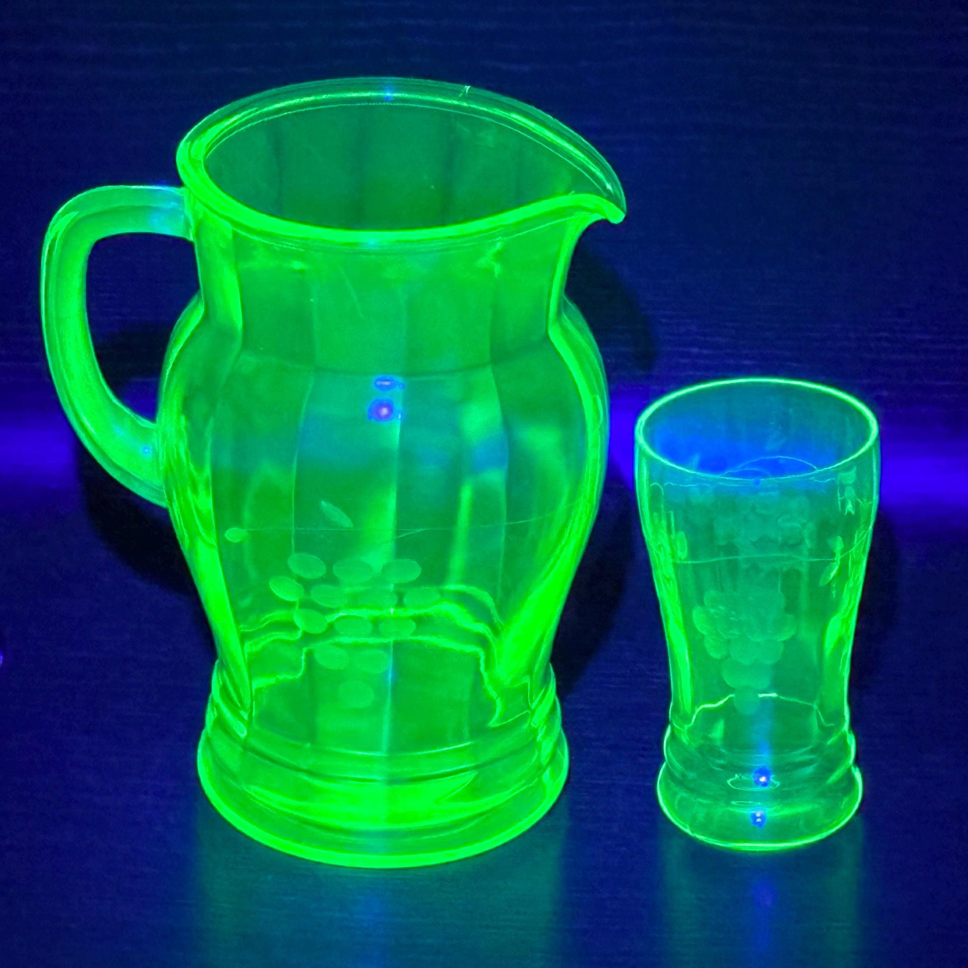 Vintage Uranium Glass Etched Pitcher and 4 Glasses