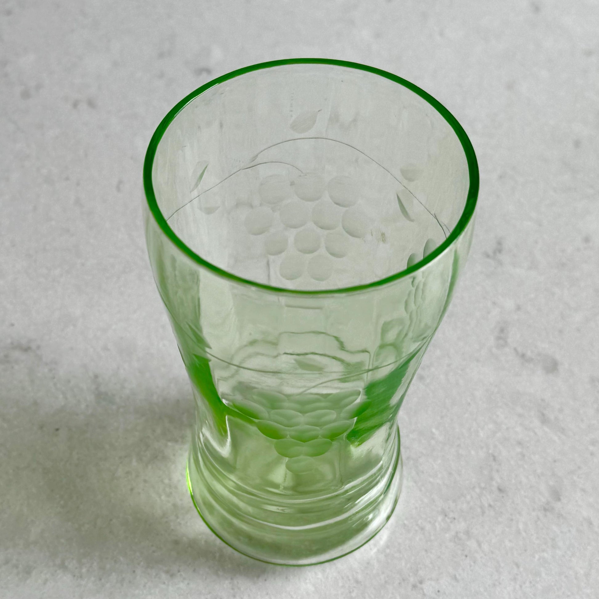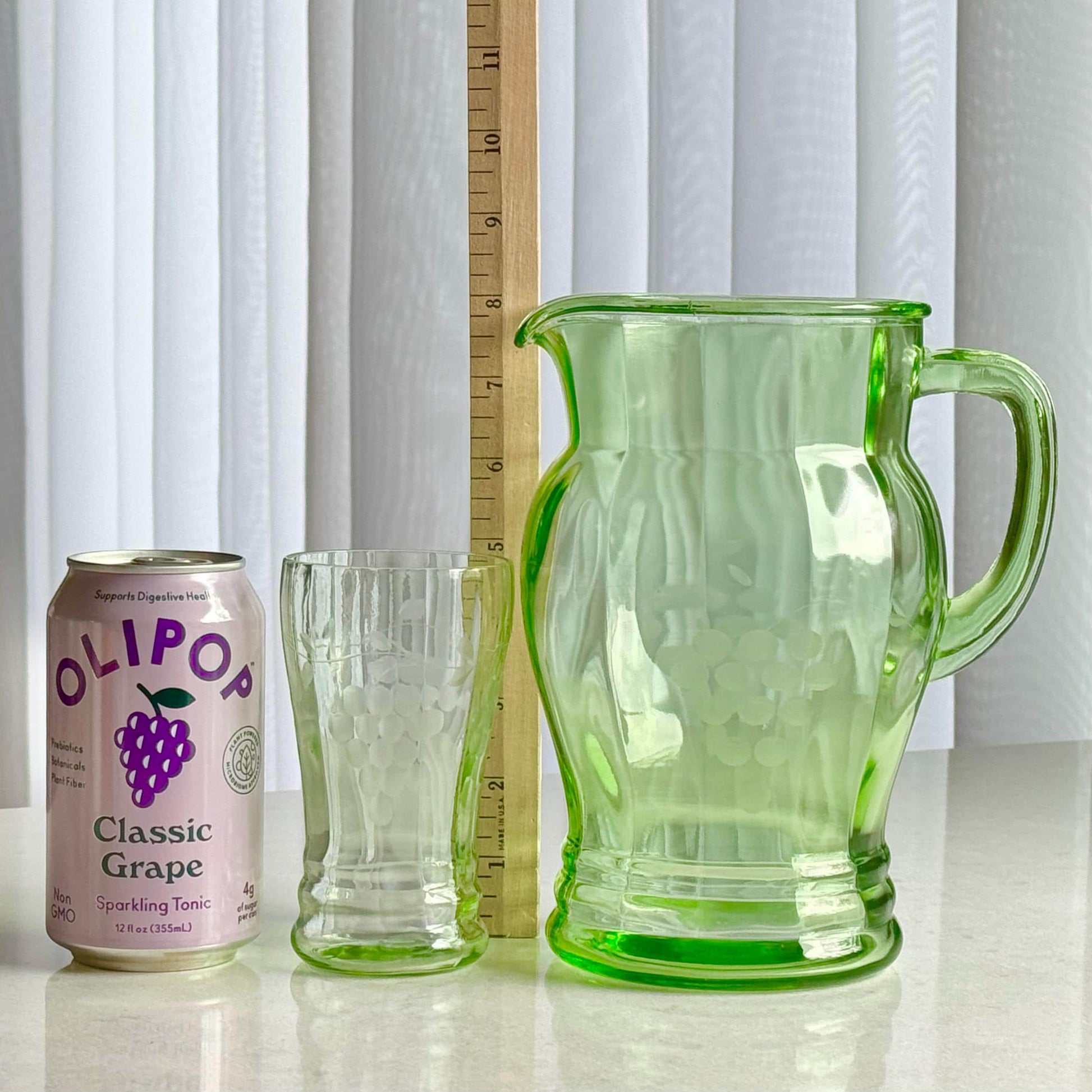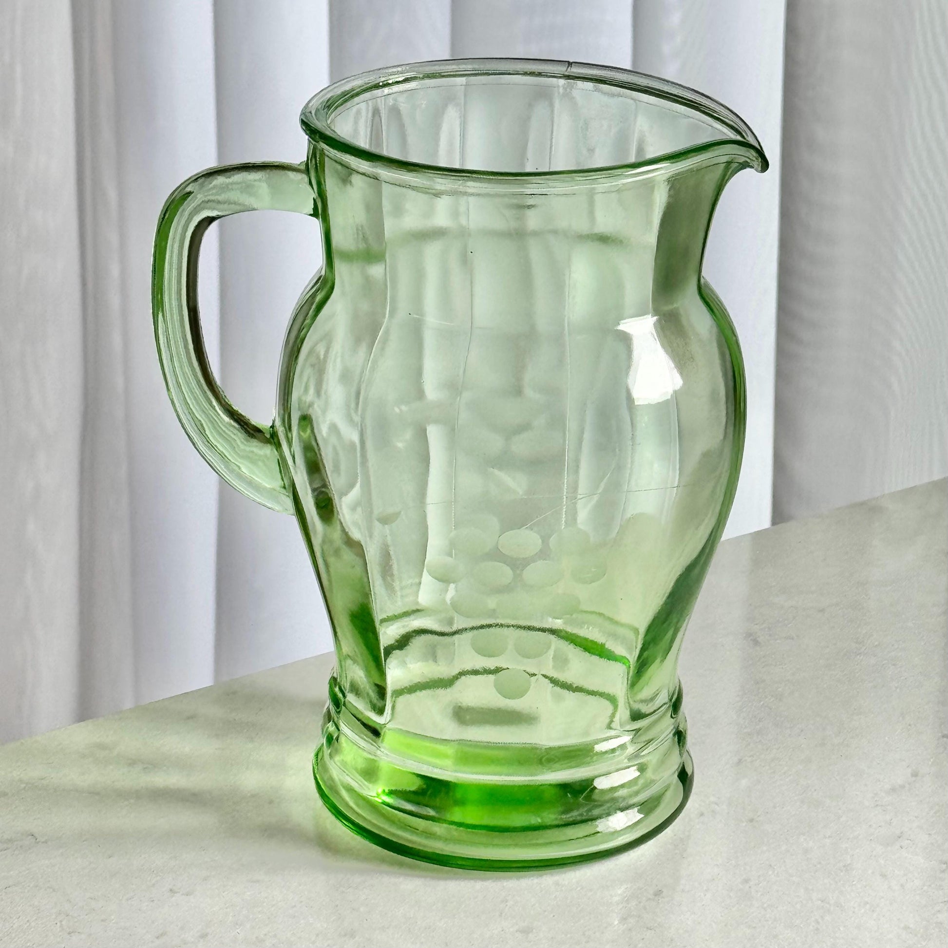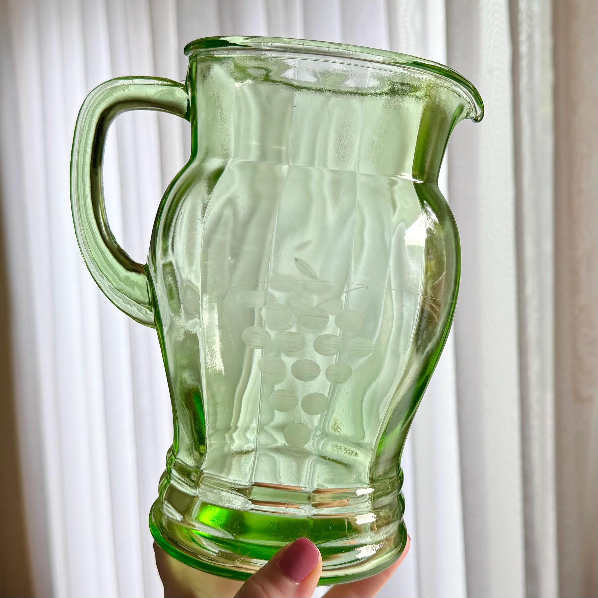 Vintage Uranium Glass Etched Pitcher and 4 Glasses