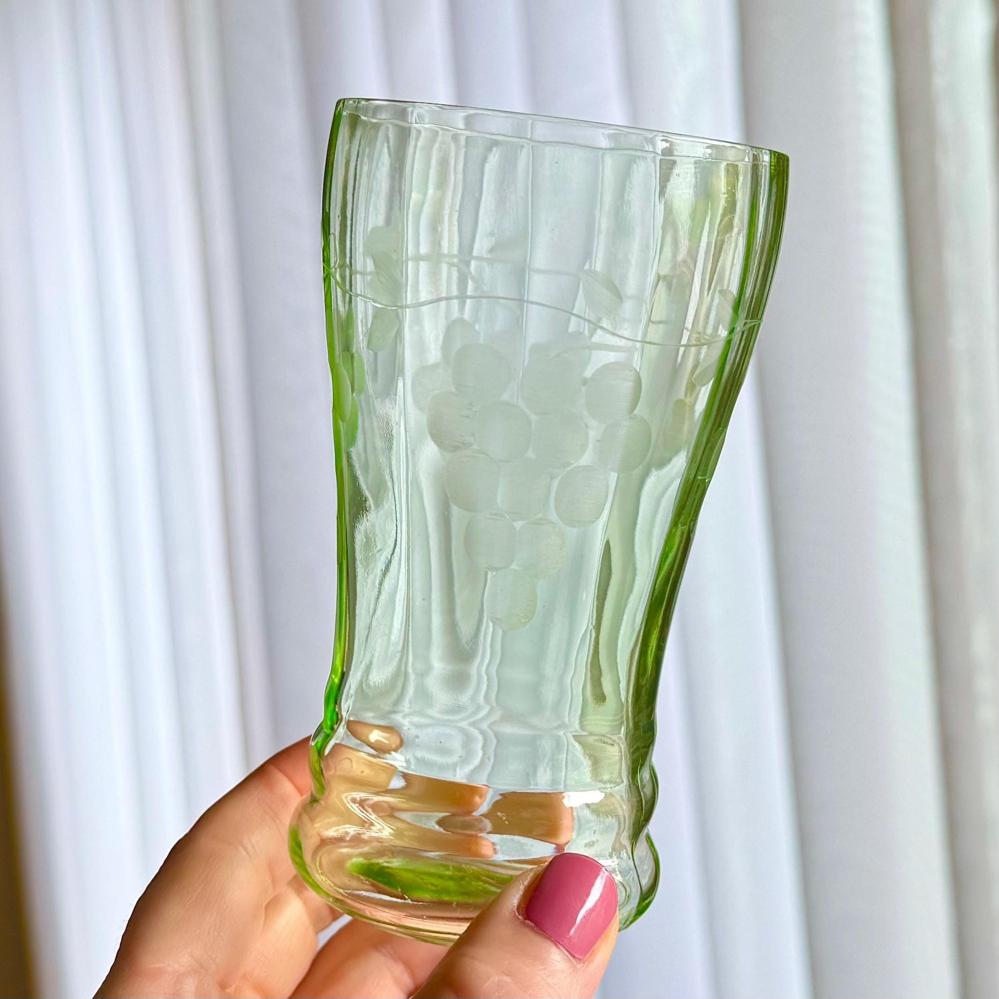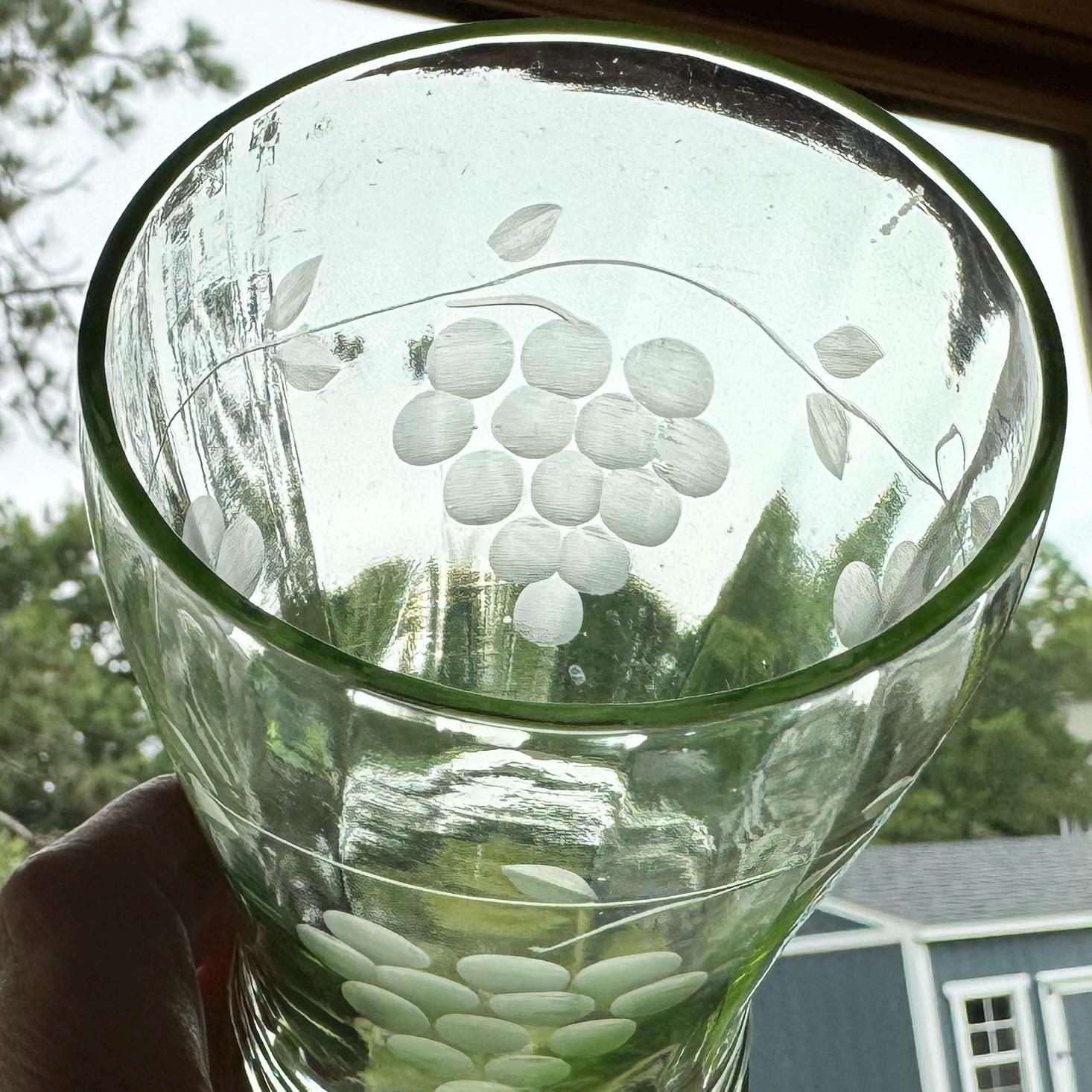 Wonderful set that includes a pitcher and four glasses, all with an etched grape design.