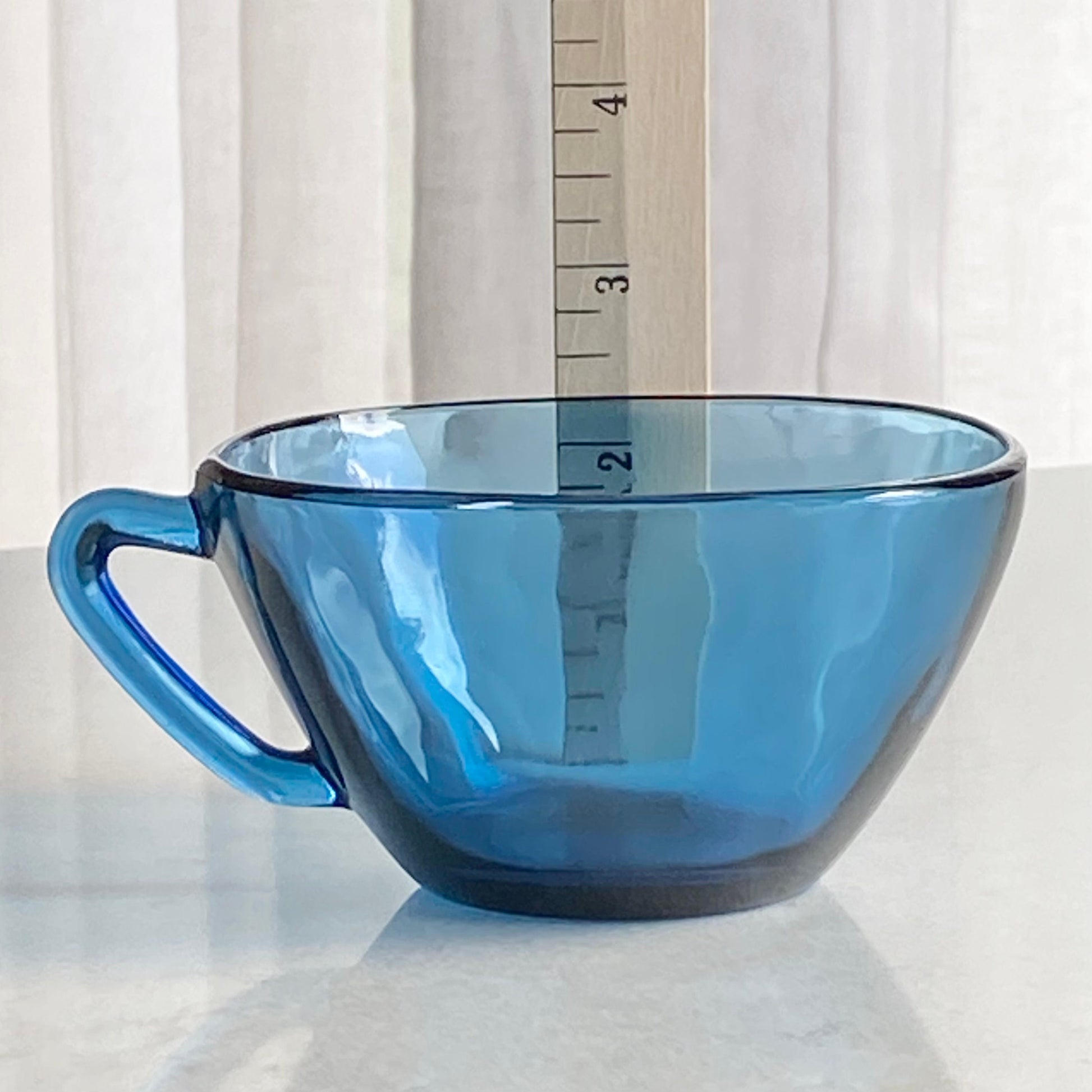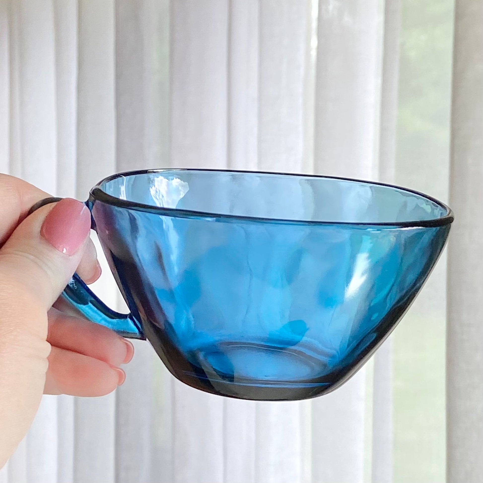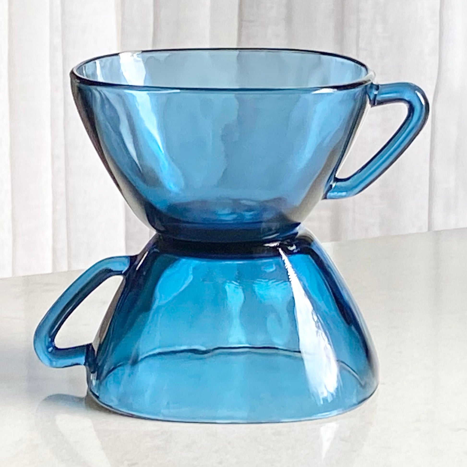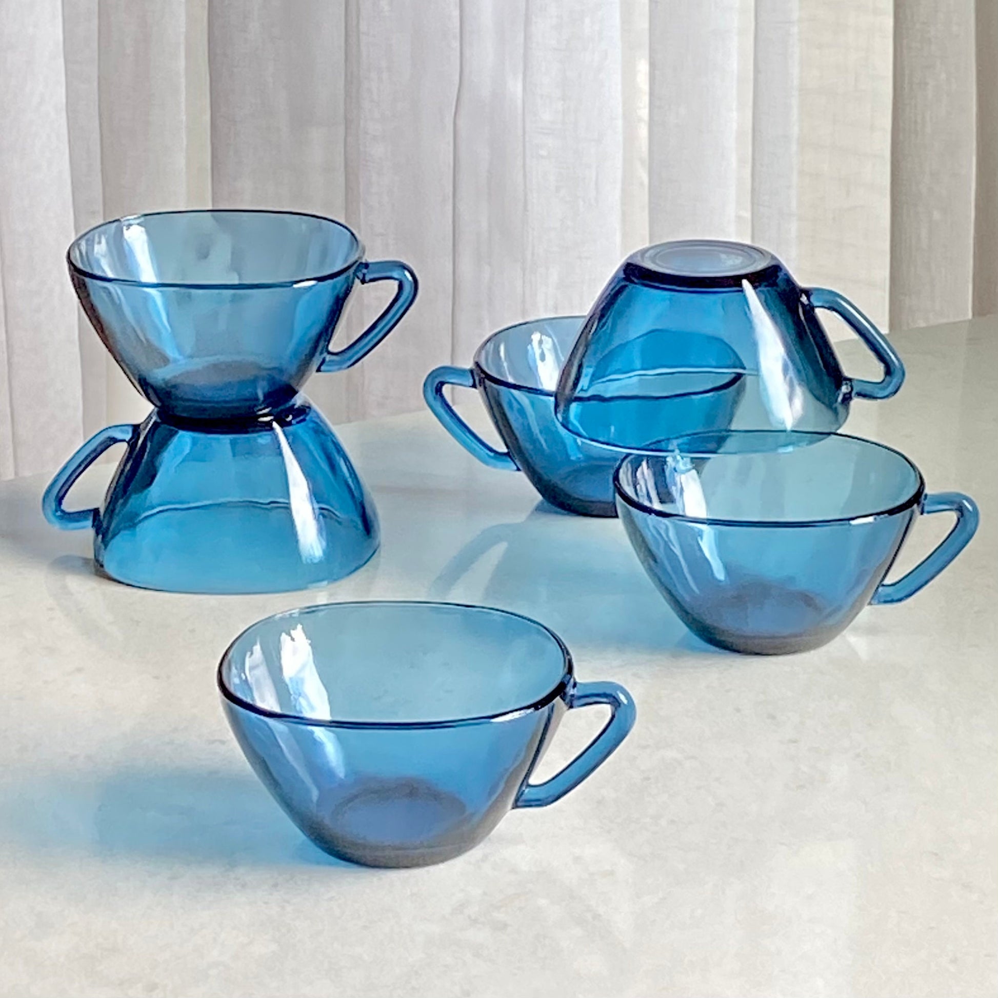 Set of six blue cups with a fun square shape! The cups are marked "Vereco" and "France" on the bottoms.