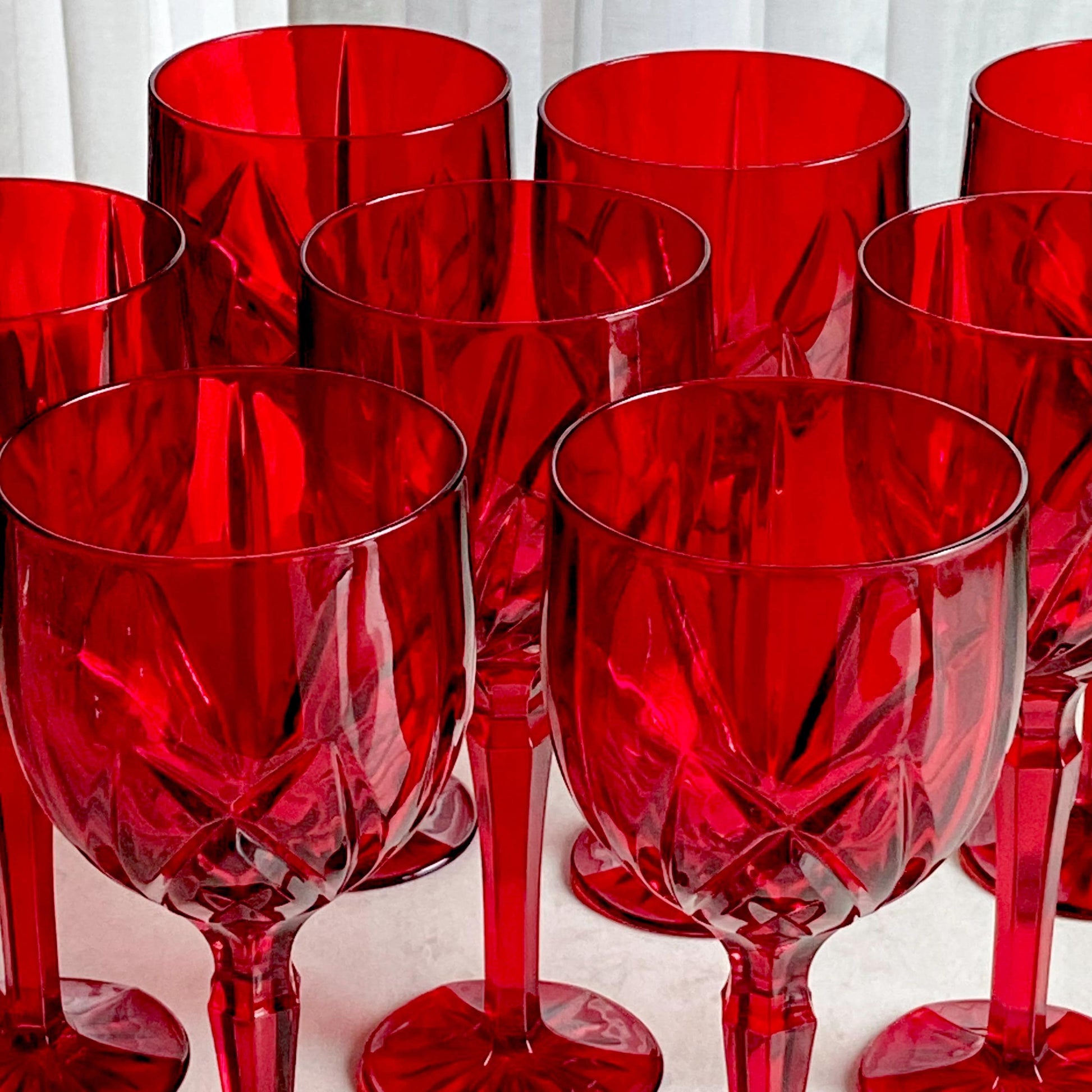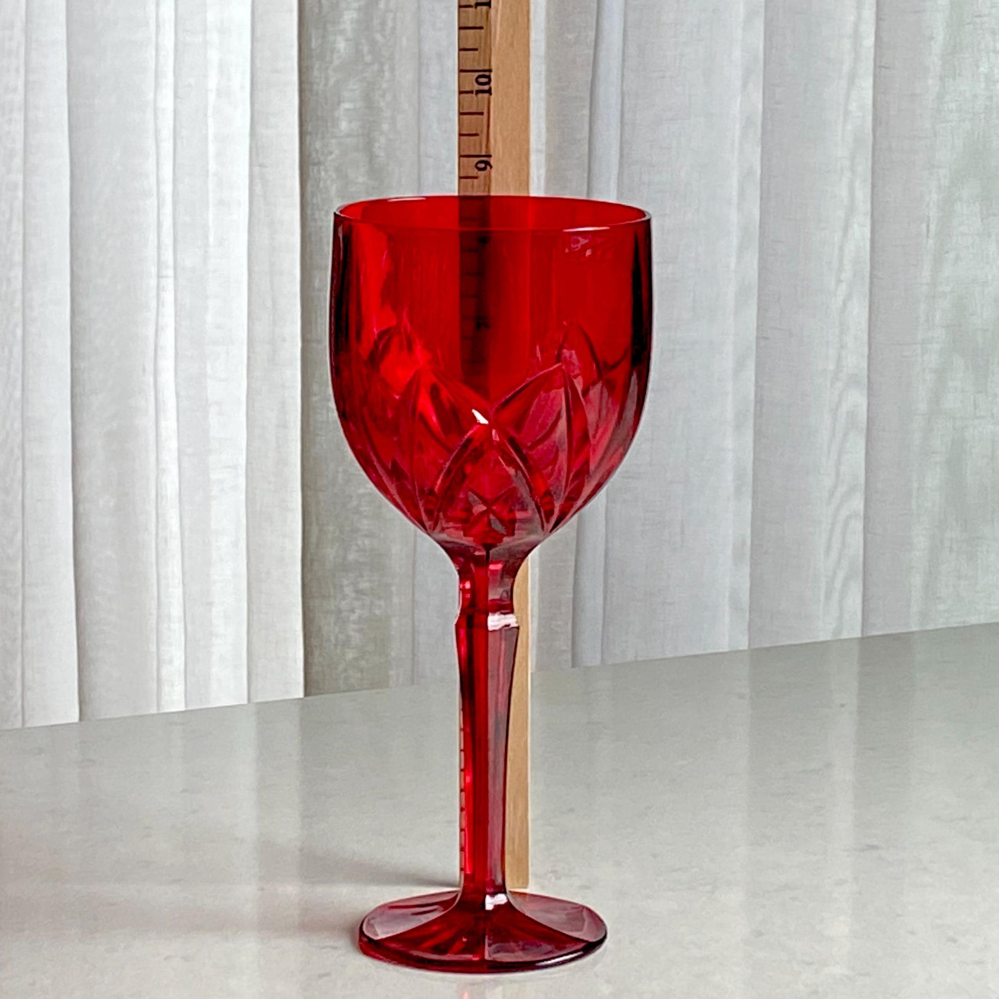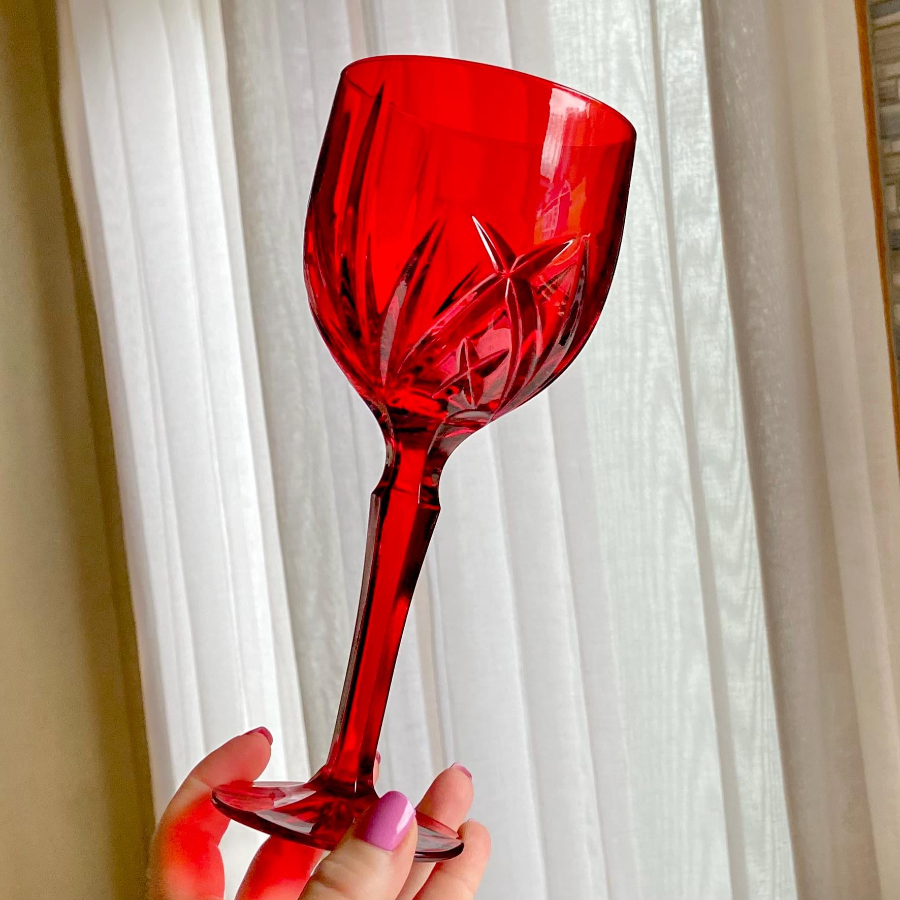 Set of eight vibrant red goblets! Approximately 8-1/2” tall and 3-1/2" across the rim with a capacity of about 14 ounces completely full. Excellent vintage condition. Note these are LARGE glasses as shown by photos with the ruler and the standard sized can for scale. There are also tumblers available as shown in the last photo and listed separately. FREE SHIPPING in the continental U.S. included in the price. If you are outside of this area or have a specific shipping request please contact me for options. Any props used are for photo purposes only and are not included with the items being sold.