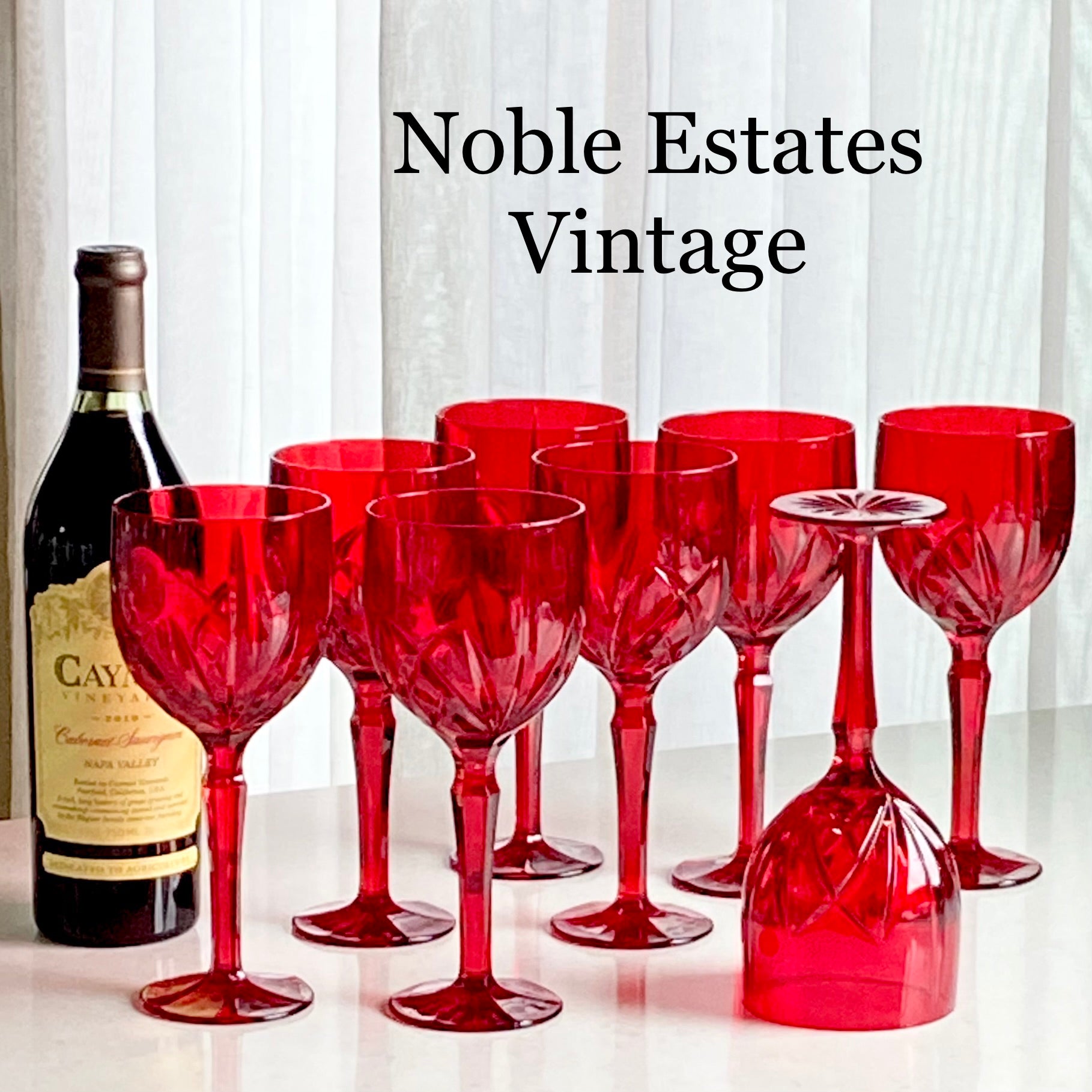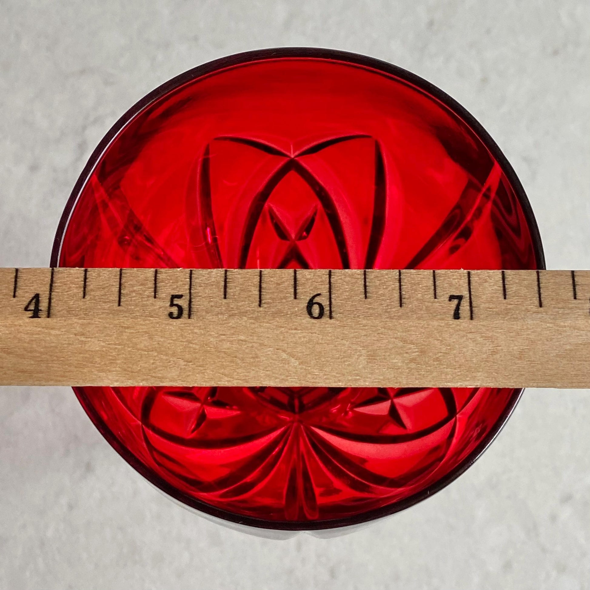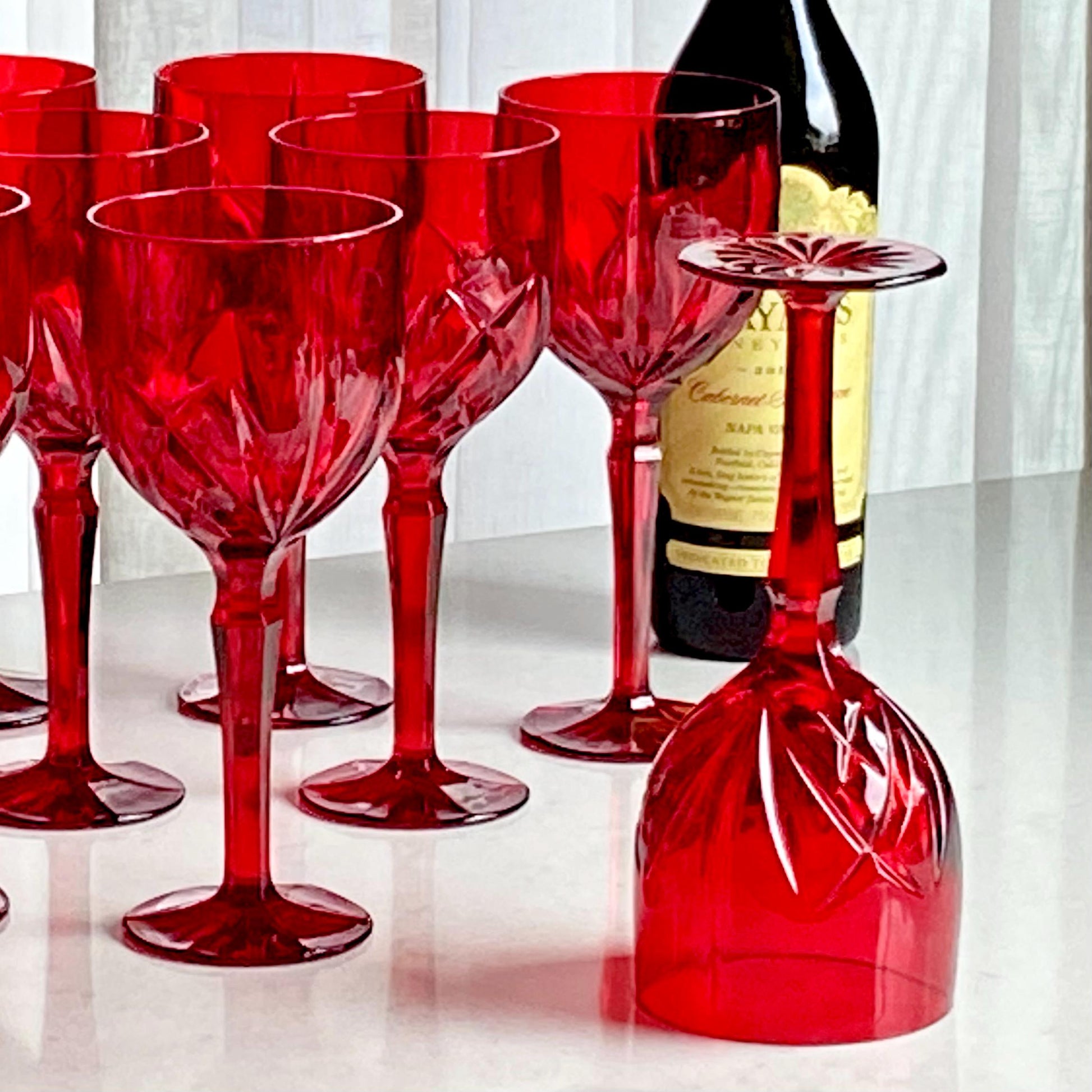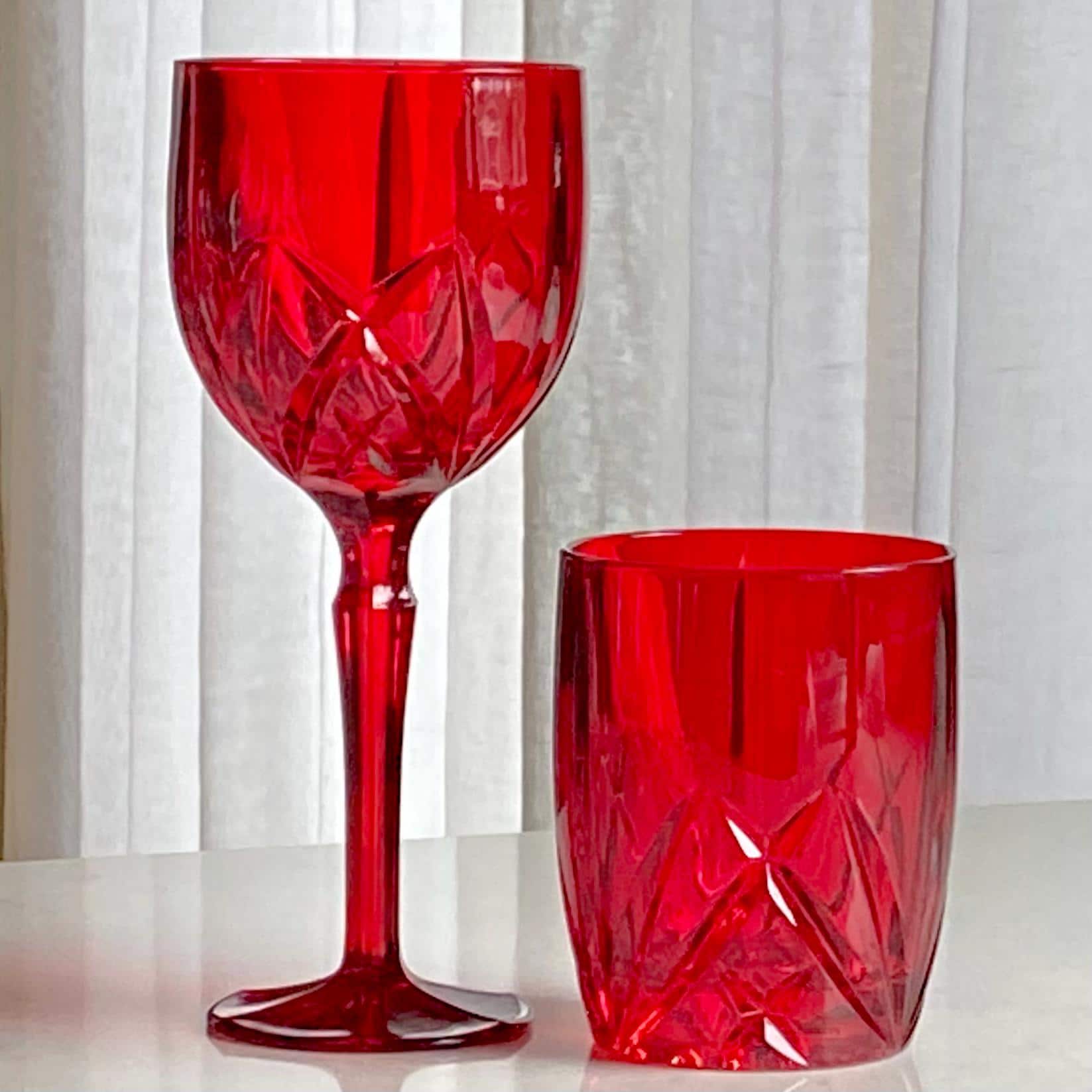 Set of eight vibrant red goblets! Approximately 8-1/2” tall and 3-1/2" across the rim with a capacity of about 14 ounces completely full. Excellent vintage condition. Note these are LARGE glasses as shown by photos with the ruler and the standard sized can for scale. There are also tumblers available as shown in the last photo and listed separately. FREE SHIPPING in the continental U.S. included in the price. If you are outside of this area or have a specific shipping request please contact me for options. Any props used are for photo purposes only and are not included with the items being sold.