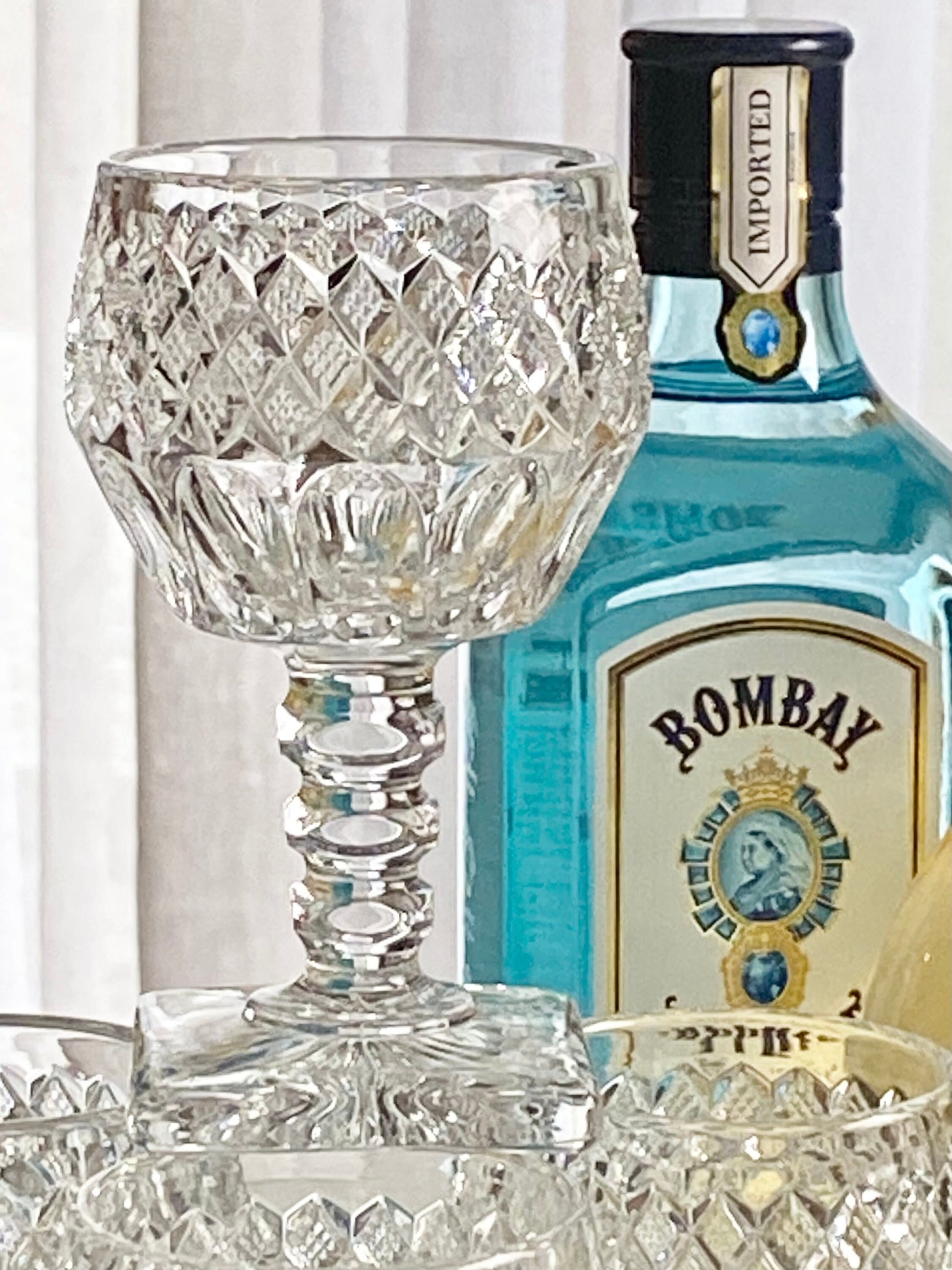 Set of six glasses with a lovely bowl design, interesting stem and square foot.